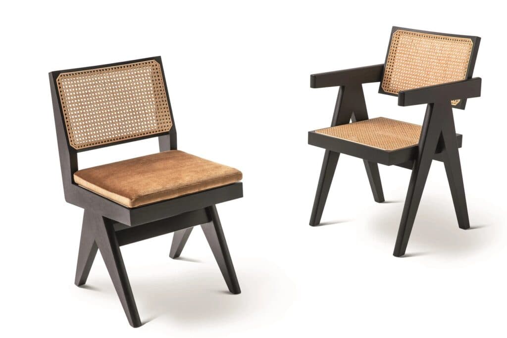 Dieser Stuhl ist eines der bekanntesten Modelle aus der Einrichtung des Capitol Complex in Chandigarh, der sich in mehreren Verwaltungsbüros des Secretariat-Gebäudes befand. Er besteht aus getrennten Elementen, darunter die seitlichen Stützen, die in Form eines umgekehrten „V“ positioniert sind, um zusammenlaufend die Armlehne zu stützen, die ebenfalls aus Massivholz gemacht ist. Das Korbgeflecht von Sitzfläche und Rückenlehne in einem Holzrahmen ist hingegen ein charakteristisches Merkmal für das Wesen des Ortes, das auch bei der Verwendung lokaler Holzarten wie Teak zum Ausdruck kommt. Genau wie der bekanntere Office Chair verwendet auch der Stuhl ohne Armlehnen die “V”-förmigen Auflagen, die in diesem Fall kürzer sind, weil sich sich nicht bis hin zur Armlehne erstrecken. Bei diesem Stuhl hat die Sequenz Sitzfläche-Rückenlehne aus Wiener Stroh Priorität; diese verlaufen kontinuierlich und werden durch zwei Profile aus Holz mit massivem geometrischem Querschnitt vereint. Diese Elemente strukturieren mit den komplanaren Beinen ein Gesamtbild, das mächtig und gleichzeitig einfach ist. Die Neuauflage von Cassina bietet ausser der historischen Version aus Teakholz zwei weitere, eine aus Eiche natur und eine aus schwarz gebeizter Eiche.