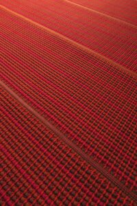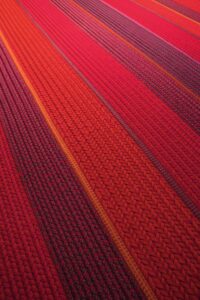 Die Oberfläche des Teppichs besteht aus zwei Lagen paralleler Bänder, die sich orthogonal überlappen und mit Punto Zigzag verbunden sind.