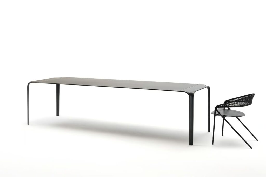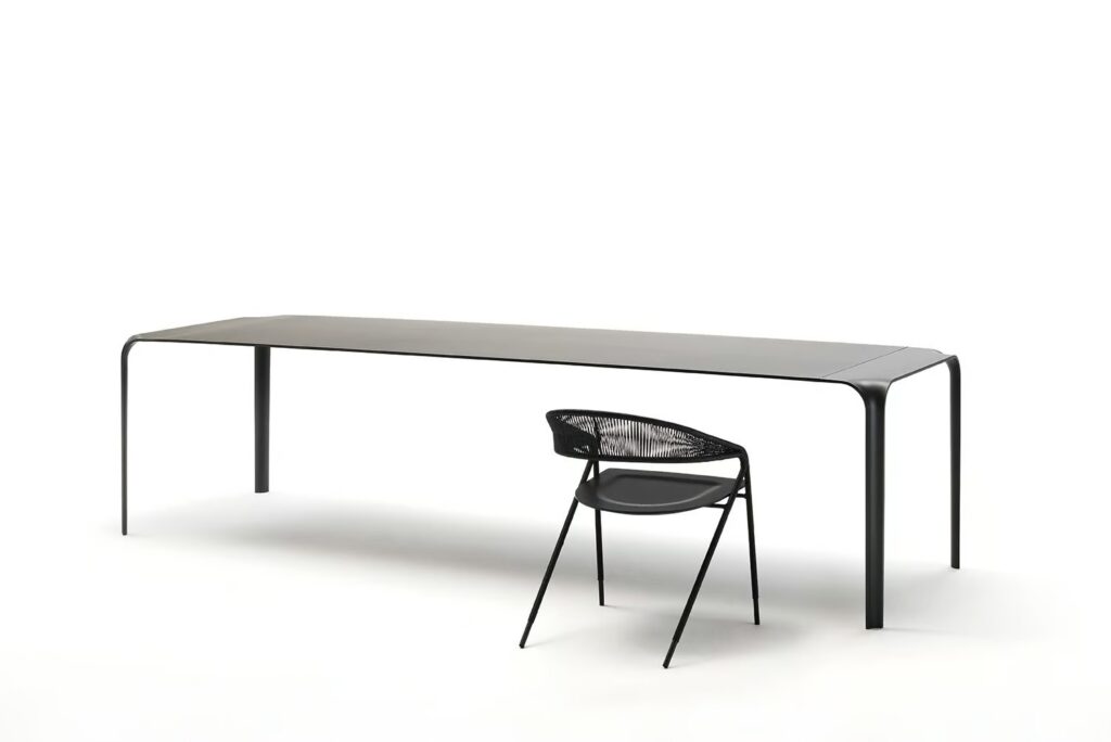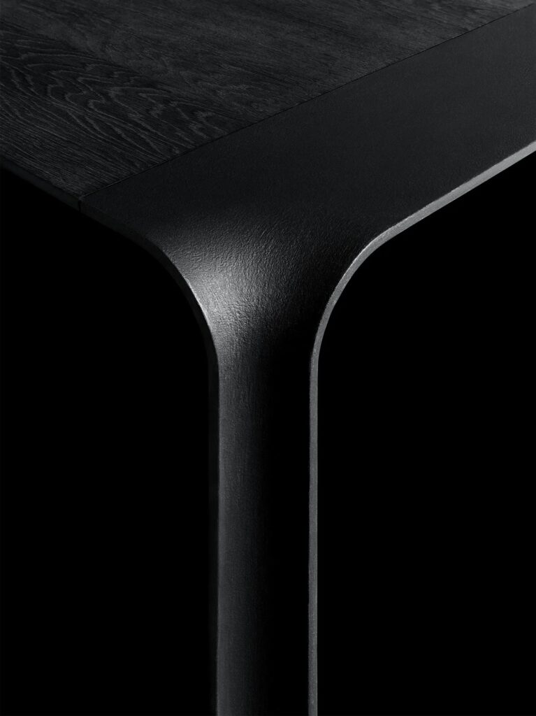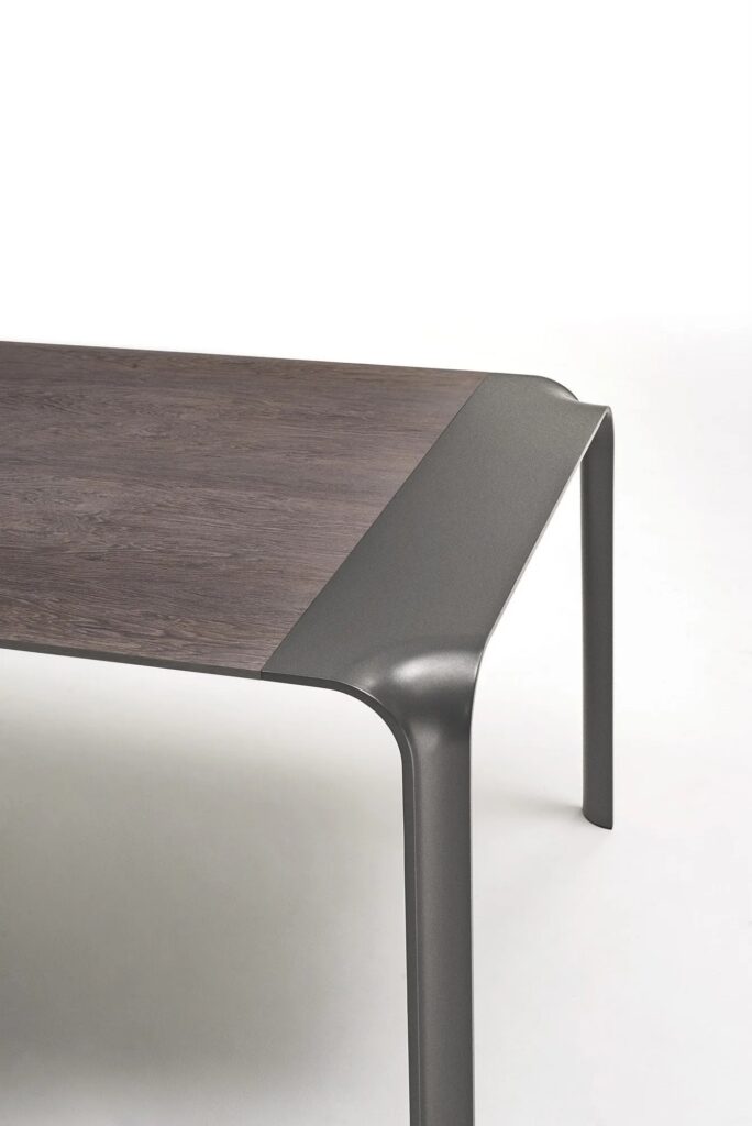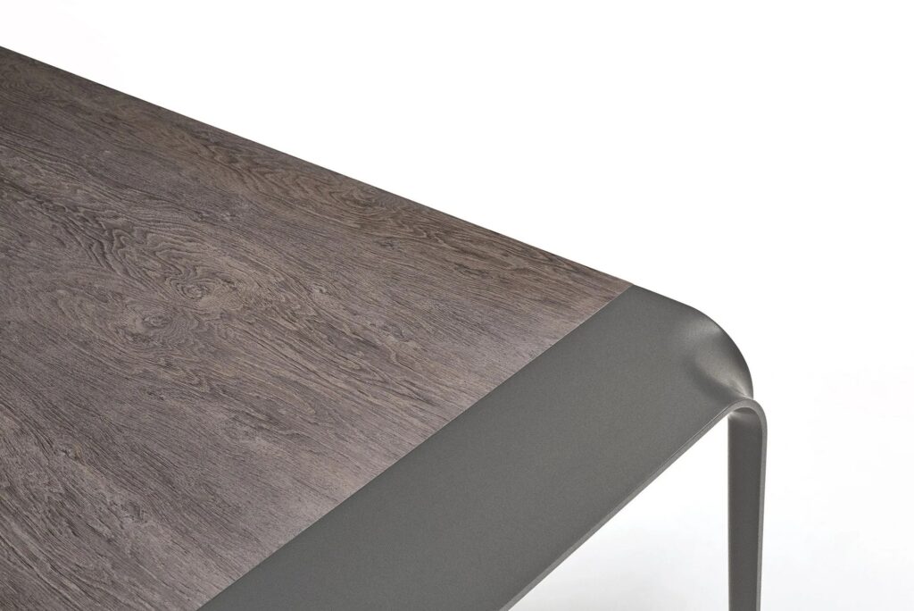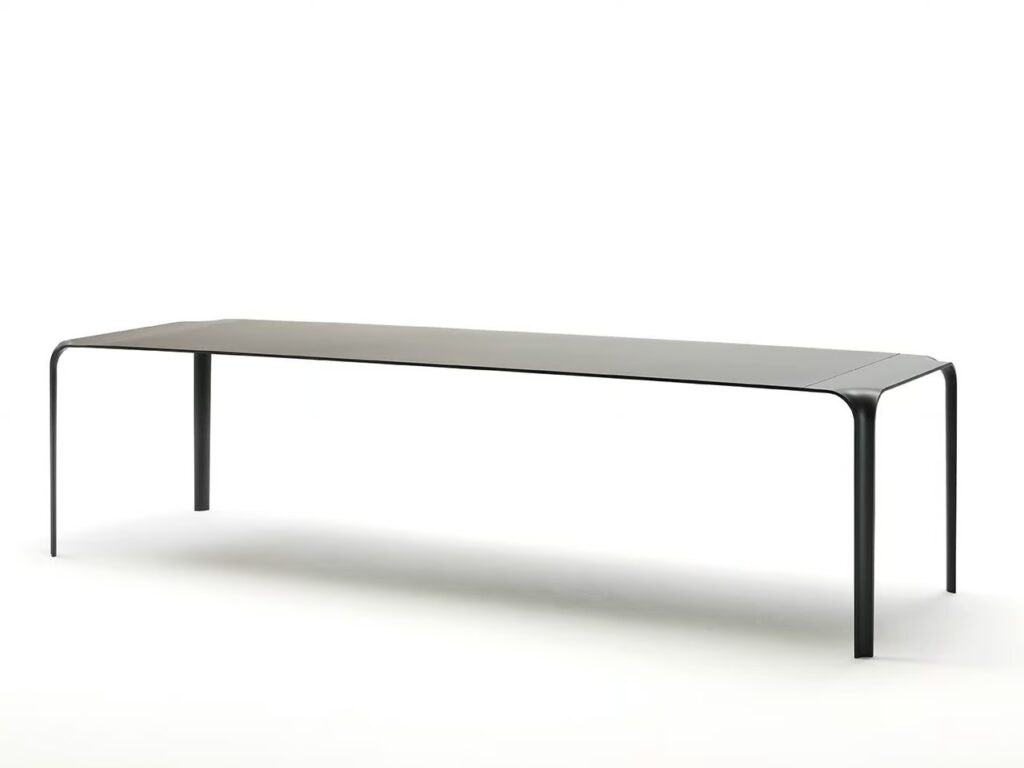 Tisch mit Beinen aus vorgeformtem Stahlblech 10 mm dick, liquidlackiert in schwarz matt RAL 9017 K-7. Platte aus MDF und Aluminiumblech miteinander in “Sandwich” gepresst und verleimt mit geklebten Stahlprofilen, um die Stabilität und Struktur zu gewährleisten.