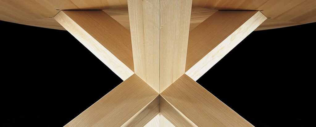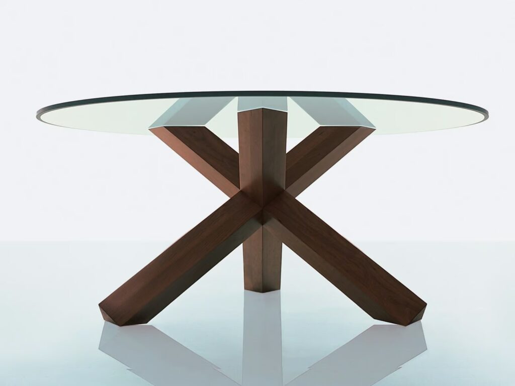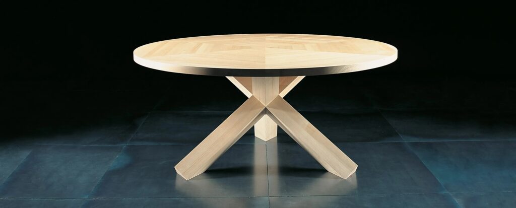 La Rotonda ist ein Tisch, der die Wärme und das Wesen des Holzes in Schönheit verwandelt. Er präsentiert sich mit einer einfachen, skulpturenhaften Basis, bei der sich drei Beine mit quadratischem Querschnitt senkrecht verkreuzen und dabei perfekt miteinander verbinden und ineinander eindringen, um die schmale Tischplatte zu stützen. Die drei Elemente werden durch solide Verbindungen zusammengehalten, die direkt aus dem Massivholz gewonnen werden: Verdienst der ausserordentlichen Holzverarbeitungskunst von Cassina, die stets im Gleichgewicht zwischen technischer Qualität und ästhetischer Raffinesse liegt. Die Basis ist aus vielen unterschiedlichen Holzarten erhältlich, mit Tischplatten aus Holz oder Kristallglas, zu denen die neuen Versionen aus weissem Carrara-Marmor, schwarzem Marquiña-Marmor und braunem Emperador-Marmor hinzukommen.