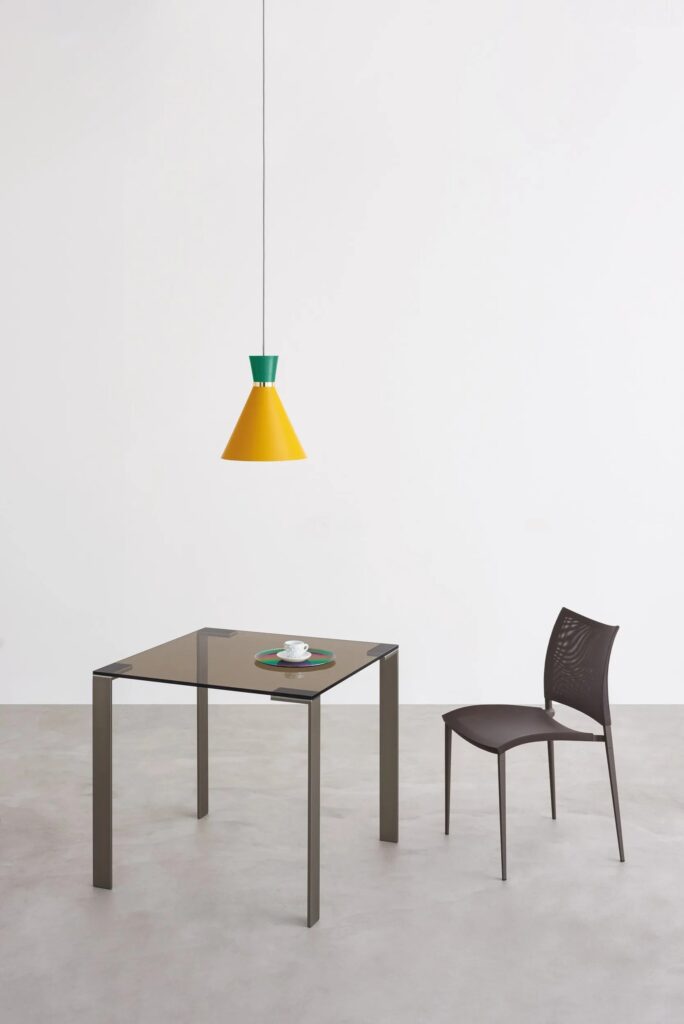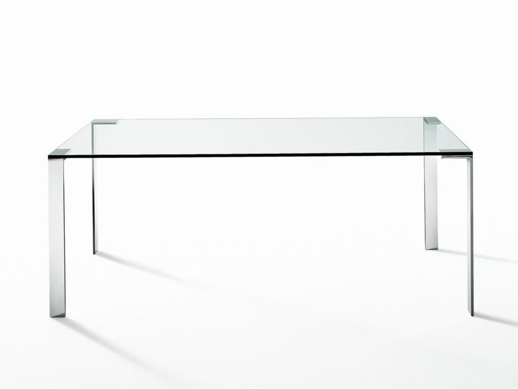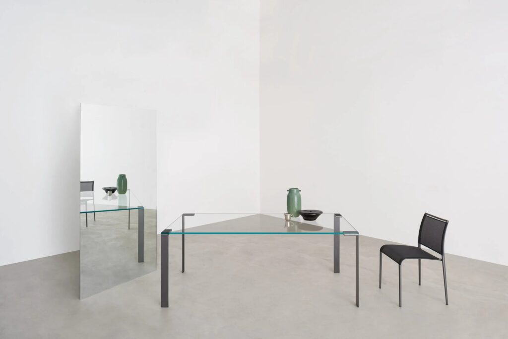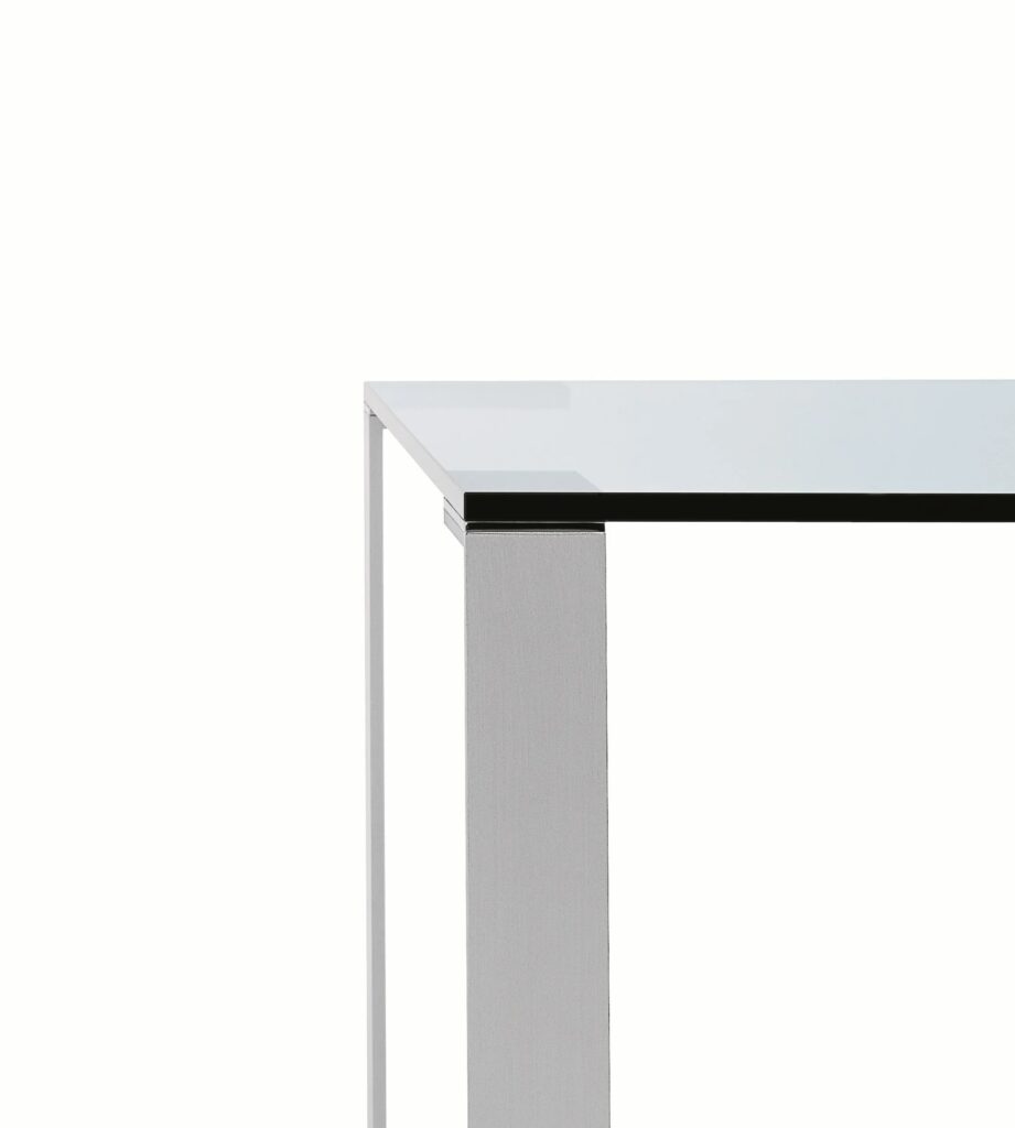 Tisch mit temperierter Glasplatte und Stahlbeinen.