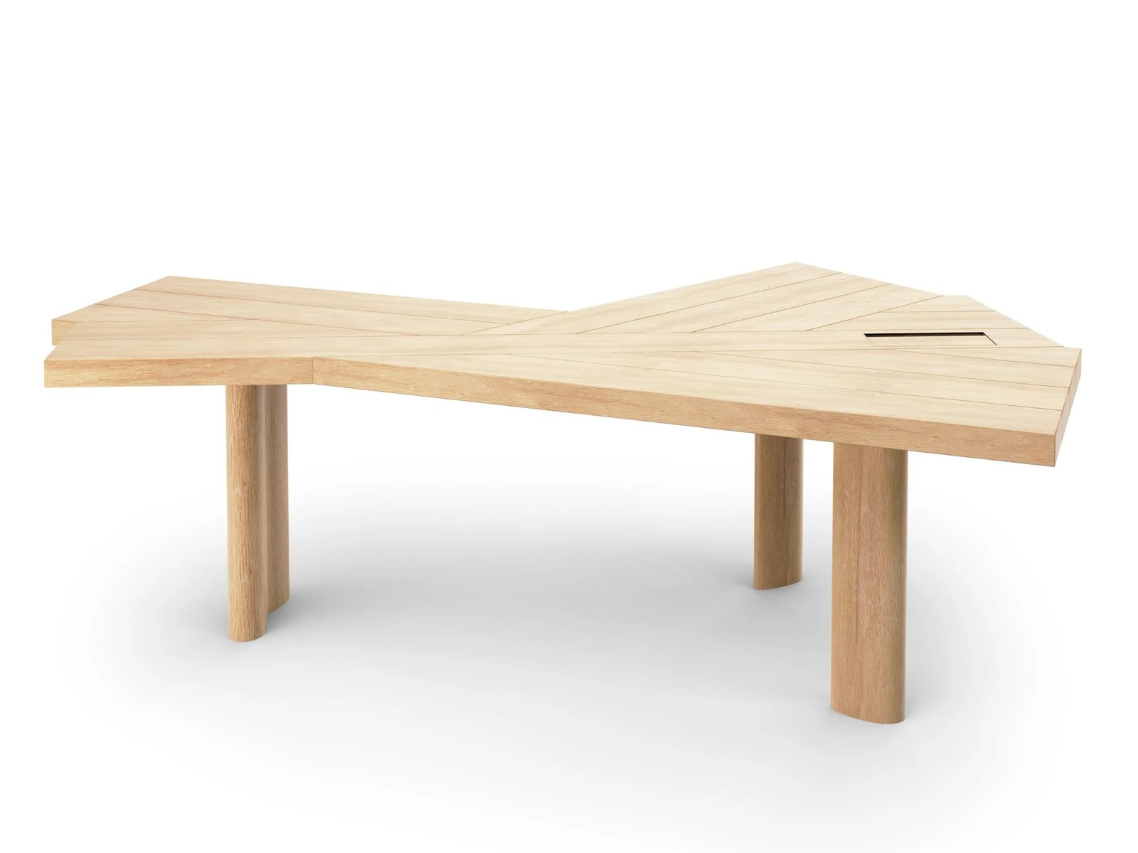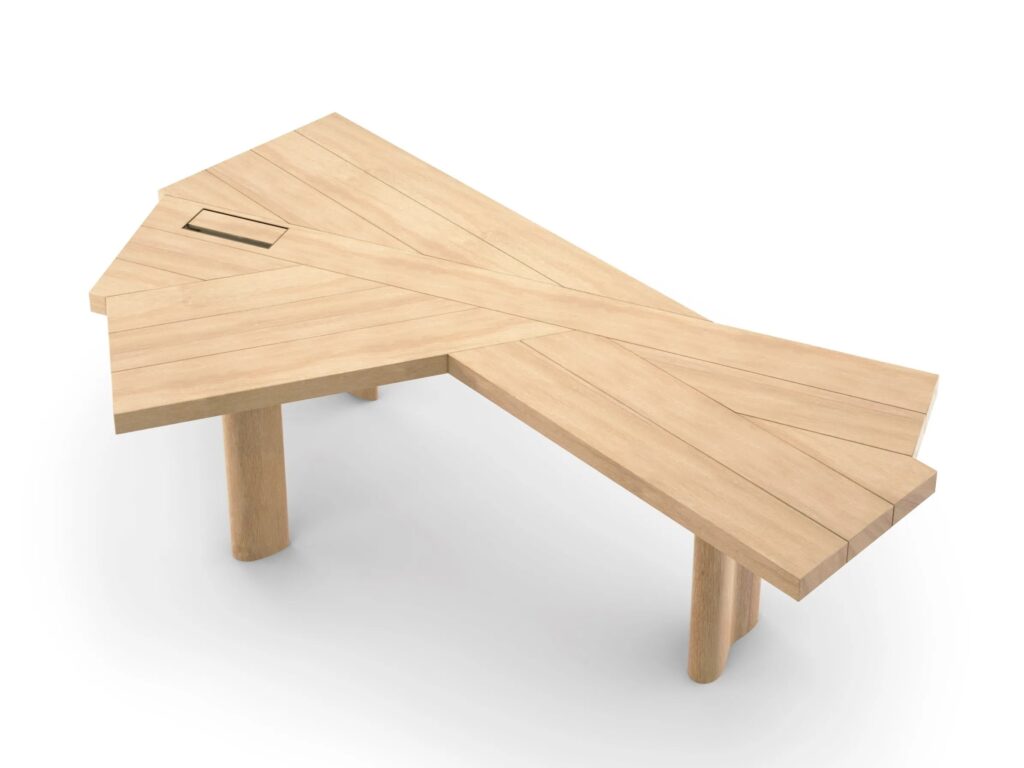 Ein revolutionäres Möbelstück mit Mehrzweckcharakter, das sich aufgrund seiner Form und Verwendung auf einzigartige Weise von allen anderen Tischen unterscheidet. Eine vollendete Synthese der Lebenskunst von Charlotte Perriand. Die Struktur entsteht aus der einfachen und gleichzeitig perfekten Montage von vierzehn Latten, die nebeneinander gelegt und in Cassinas Tischlerei gekonnt zusammengesetzt werden. Die einzelnen Elemente vereinen sich in einem strukturellen Komplex, der besonders elegant und vielseitig ist und in jedem Ambiente auf dynamische und innovative Weise interpretiert werden kann. Als Esstisch kann Ventaglio bequem 5 bis 9 Personen Platz bieten, je nach Raumbedarf des mittleren Abschnittes. Als Schreibtisch kann seine unregelmässige Form einer unterschiedlichen Anzahl von Personen Platz bieten, je nachdem, wie viel Platz Computer und Arbeitsinstrumente einnehmen.