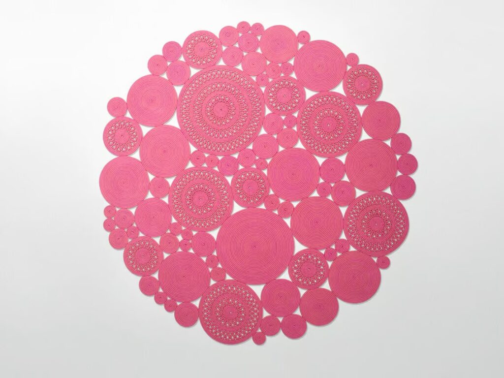 COSMO - Teppiche für Innen- und Außenbereiche. Die Elemente, aus denen sich die Oberfläche des Teppichs zusammensetzt, werden vollständig von Hand mit einer ein- oder zweifarbigen Kordel hergestellt. Sie werden in verschiedenen Dimensionen und mit verschiedenen Produktionstechniken hergestellt: einige werden durch das Nähen der Kordel in einem spiralförmigen Muster hergestellt, andere werden zu runden, dekorativen Modulen geformt. Die Elemente werden dann mit einem Garn in der gleichen Farbe wie die Kordel zusammengenäht.