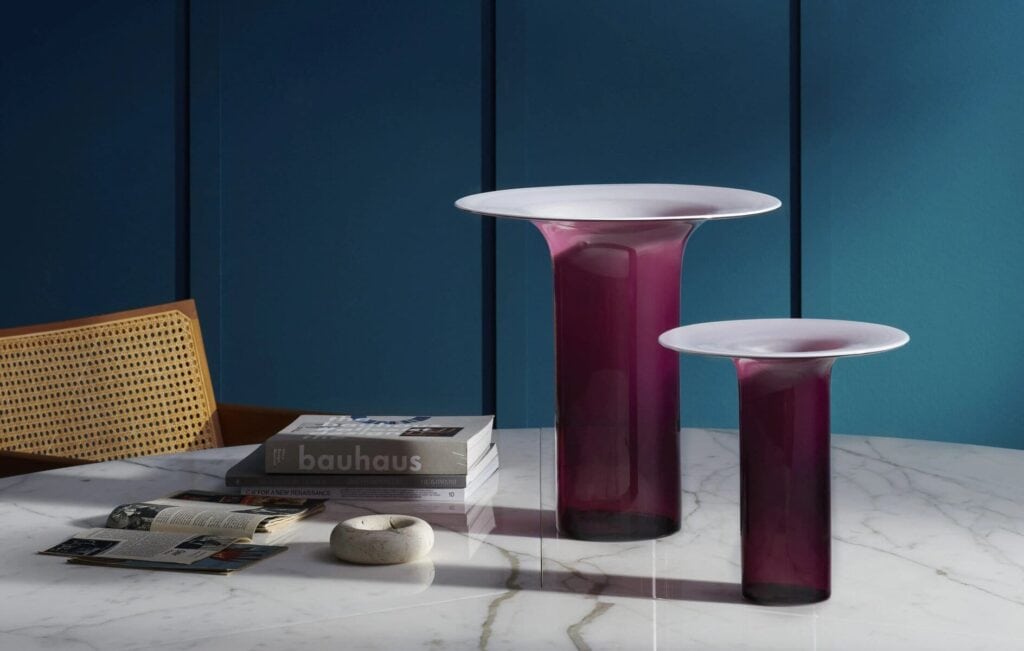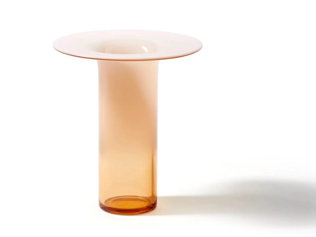 Silvan wird durch die Calla-Blüte und ihre geschwungene Form, die das Wasser aufnehmen kann, inspiriert. Die Vase ist aus schattiertem geblasenem Glas. Erhältlich in den Farben Rosa schattiert und Amethyst schattiert.