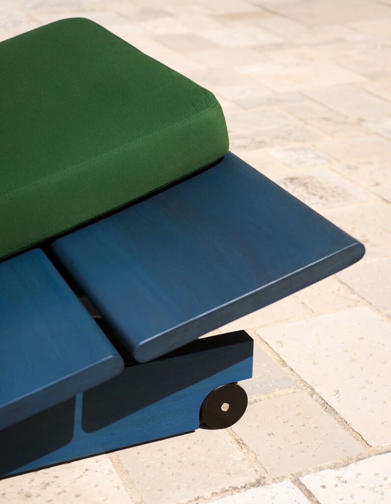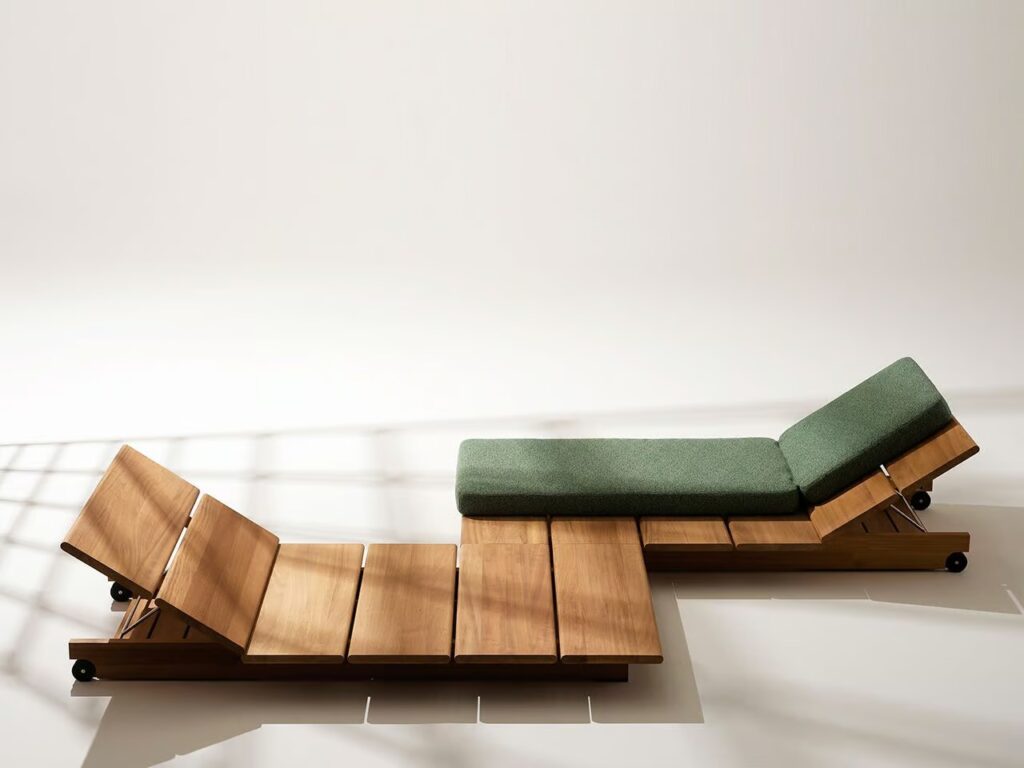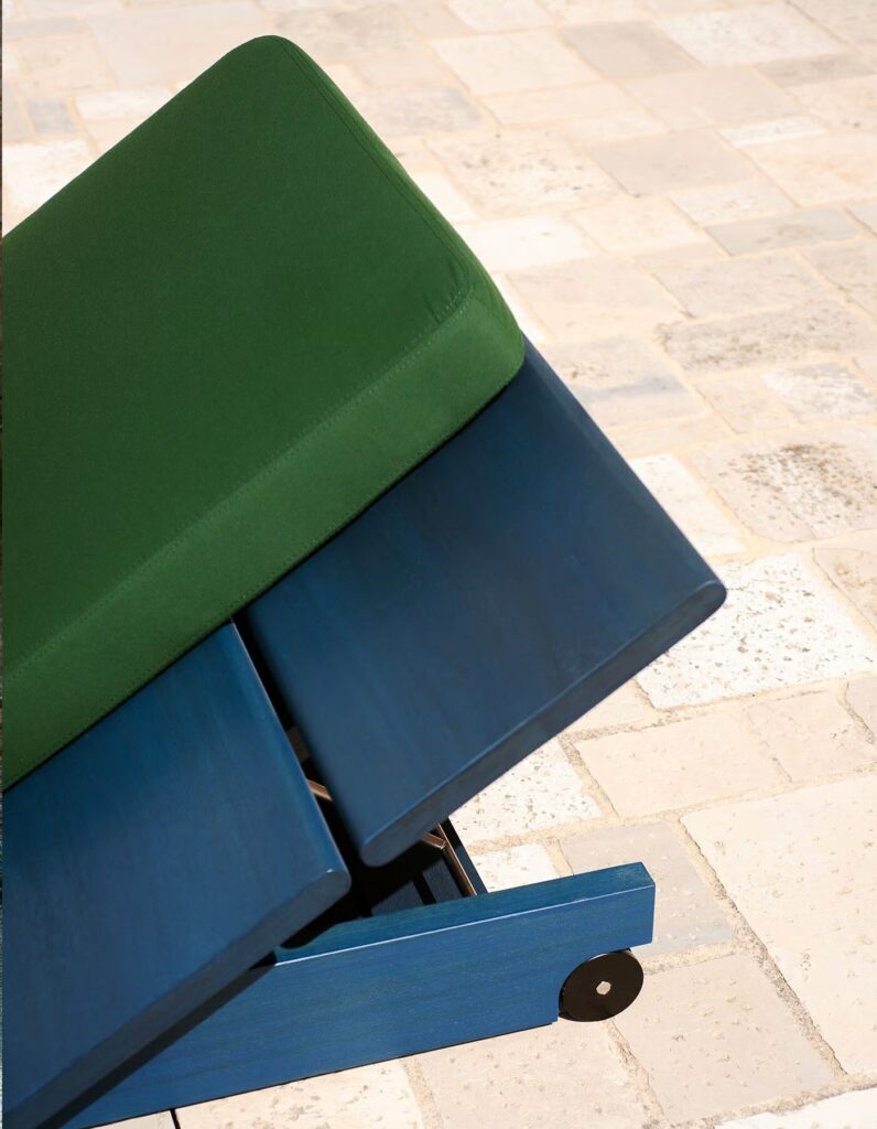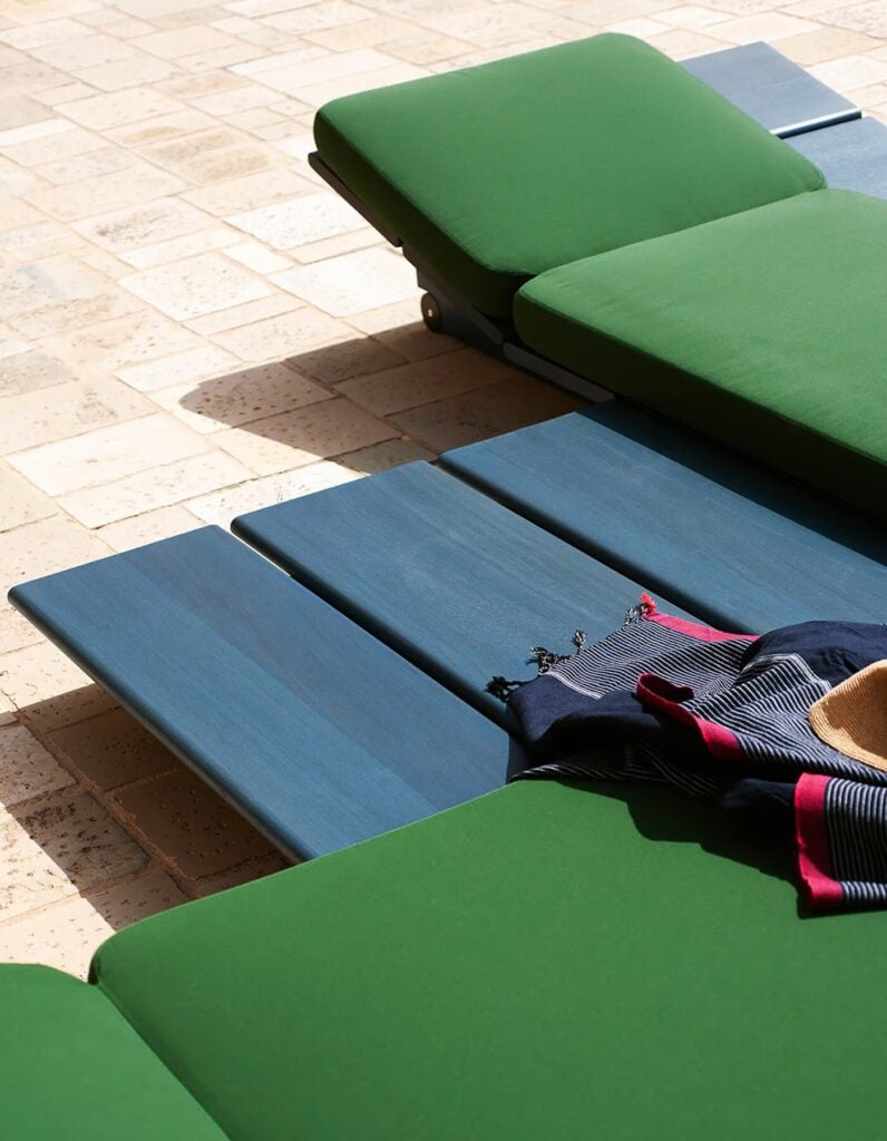 Wie eine Inselgruppe aus Elementen, die um eine große Iroko-Holzlatte herum entworfen und angeordnet sind. Ein besonderes Element ist die Kombinierbarkeit zwischen seinen Komponenten: Sonnenliegen, Tische, Pavillons, die Sie am Pool, auf einem Boot oder am Meer genießen können. In diesen Komfortinseln wird die Wahl der Farbe – zwischen Holz und Bezügen – zu einer weiteren Variablen: Das Holz ist naturbelassen oder in drei entsättigten Variationen lackiert, mit sichtbarer Maserung; Bei den Stoffen für die Kissen gibt es eine große Auswahl an Farben, die zusätzlich zur dickeren Armlehne in zwei Größen erhältlich sind.