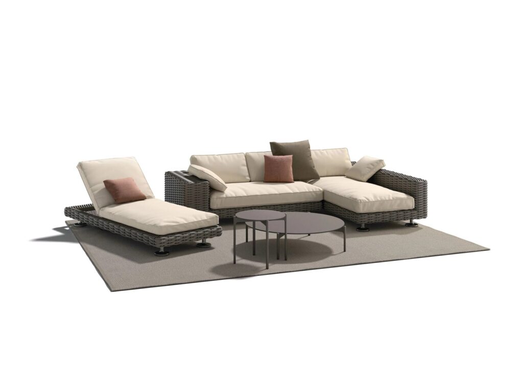 PAROS zeichnet sich durch einfache, bequeme Kompositionen und niedrig liegende Formen aus, die über dem Boden zu schweben scheinen und für klare, übersichtliche Ansichten sorgen. Mit ihren grossen runden Füssen aus Edelstahl kann die Kollektion sowohl auf dem Rasen oder dem Boden als auch auf einer Terrasse oder einem Deck aufgestellt werden. Für PAROS arbeitete Massaud eng mit den Faserspezialisten von DEDON zusammen, um einen neuen Strang organischer, natürlicher und fühlbarer Fasern zu entwickeln, die fast wie eine Ranke aussehen. Die extrabreiten Armlehnen und Rückenlehnen der Kollektion sind aus dieser neuen Faser gewebt und bieten einen hohen Sitzkomfort. Das Design ist in Silt ausgeführt, einem warmen, matten Braunton, der noch mehr Tiefe verleiht und leicht mit organischen Elementen verschmilzt.