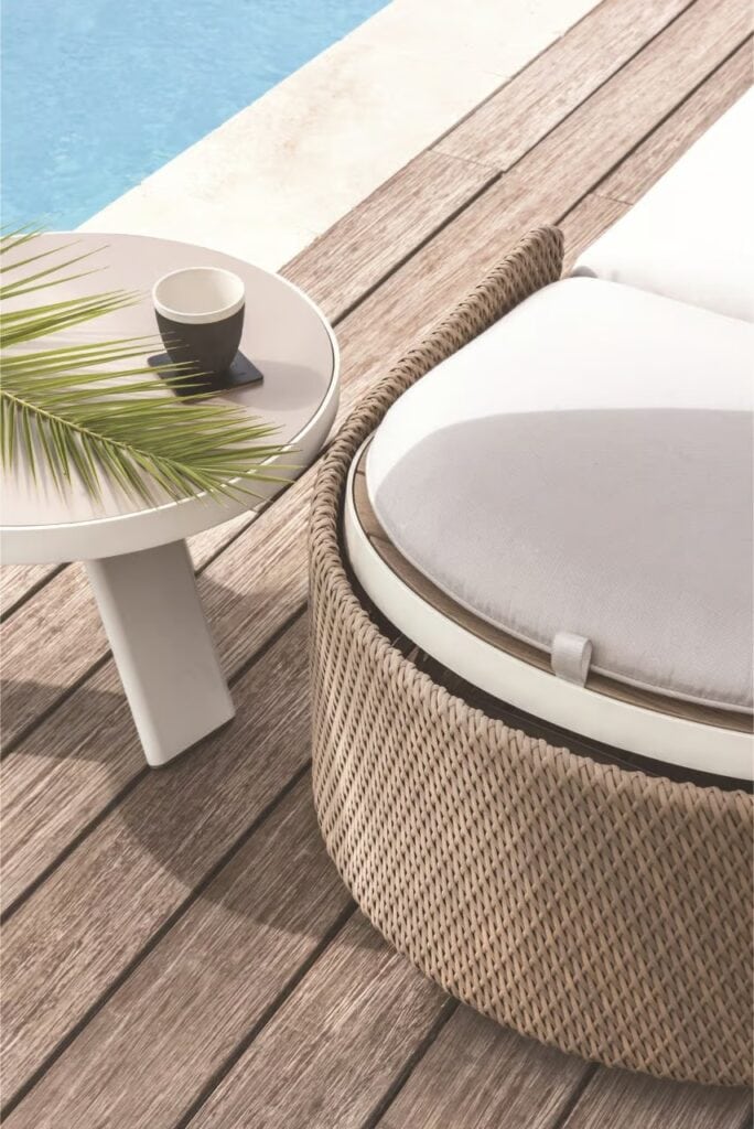 Die von Luca Nichetto entworfene Outdoor-Kollektion Esedra, der Star des neuen Ethimo-Katalogs, besticht durch ihre Ästhetik und ungewöhnliche Texturen. Zur Zeit der alten Römer war die "Exedra" ein halbkreisförmiger Raum, in dem gesellschaftliche Versammlungen und philosophische Debatten stattfanden. Die Kollektion Esedra lehnt sich an dieses Element der klassischen Architektur an, um ein komplettes Sortiment an Möbeln für einen zeitgenössischen Look im Freien zu schaffen. Dabei wird eine Beziehung zwischen den verschiedenen Materialien hergestellt, wie z. B. der Kunstfaser für die Rückenlehnen, die mit einer Technologie behandelt wird, die das Gefühl von gewebten Naturfasern vermittelt, der Stoffbezug der Kissen und die Aluminiumbeine.