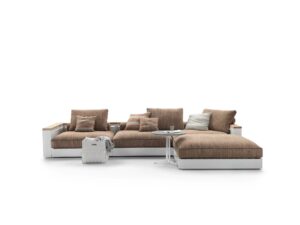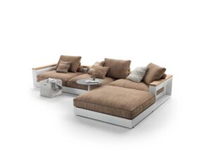 Ein Sitzprogramm, das sich durch klare, quadratische Linien auszeichnet, mit einem Untergestell vollkommen aus Aluminium, einem leichten, aber äußerst robusten Material, das sich aufgrund seiner bemerkenswerten Korrosionsbeständigkeit gegen Witterungseinflüsse und Salz besonders zur Verwendung für den Außenbereich eignet.