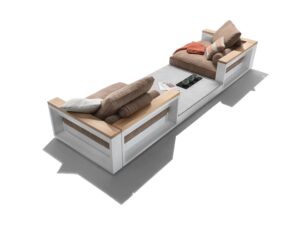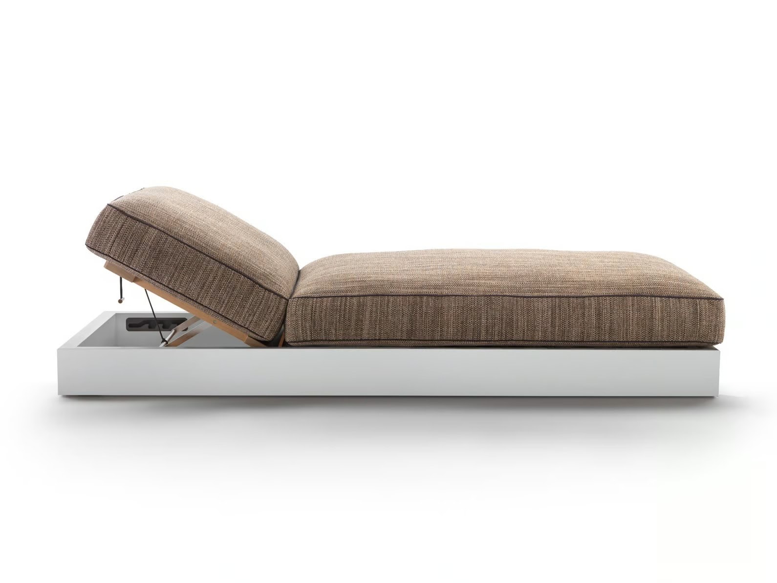 Die Liege, allein verwendet oder mit leicht anbring- und abnehmbaren Verbindungsstücken in unterschiedlich zusammengesetzte Kompositionen integriert werden kann.