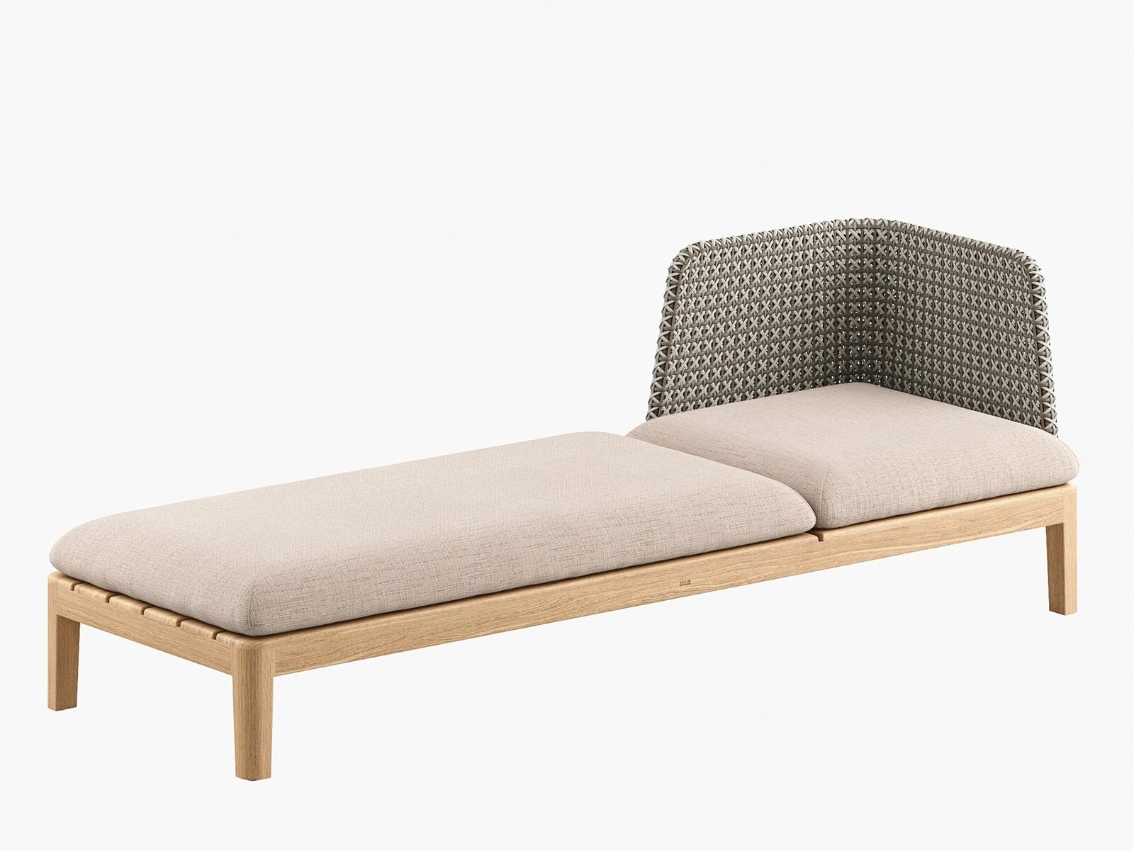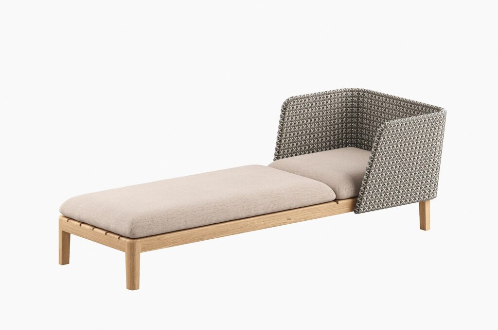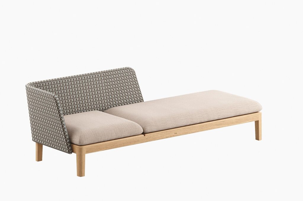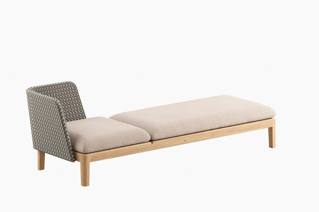 Calypso Lounge ist eine Sonnenliege aus synthetischem Stoff und Teakholz.