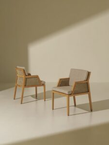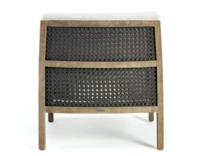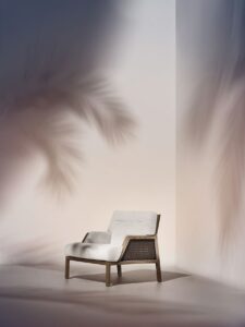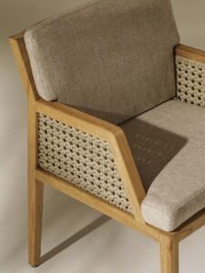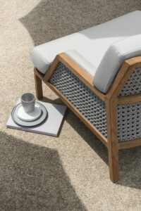 Die Wärme und Eleganz von Teakholz und leichten Fasern verbinden sich zu ausserordentlich ergonomischen und komfortablen Möbeln, die Ausdruck eines entspannteren Lebensstils und eines anspruchsvolleren Alltags sind. Der Korpus der Möbel besteht aus Teakholz mit einem Metallkern, während die Rückenlehnen der verschiedenen Sitzmöbel durch das geschickte und elegante Flechten von Acrylseilen geformt werden. Flauschige, grosszügige Kissen aus weichen Stoffen, die speziell für den Aussenbereich entwickelt wurden, unterstreichen das Gefühl von Komfort und Wohlbefinden. Eine Möbellinie für ein Grand Life" unter freiem Himmel, die in der Lage ist, die taktilen und visuellen Empfindungen zu vermitteln, die die elegantesten Situationen in Innenräumen kennzeichnen.