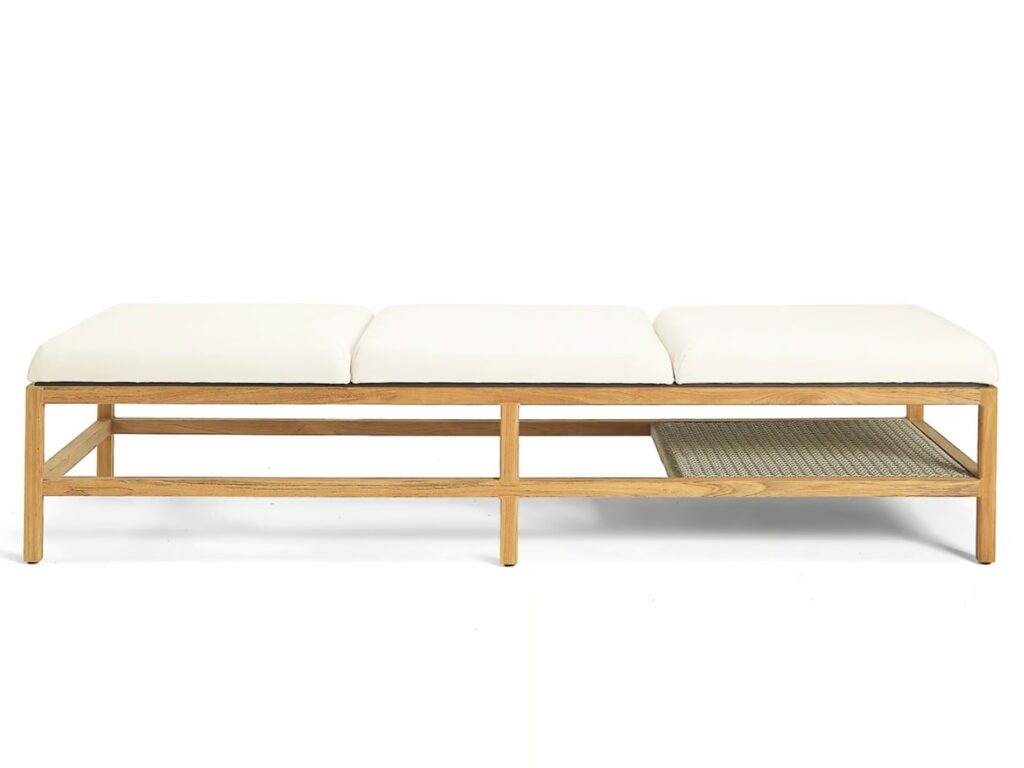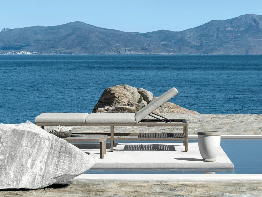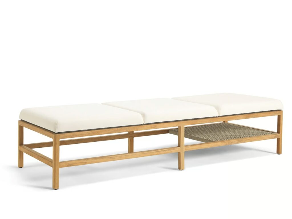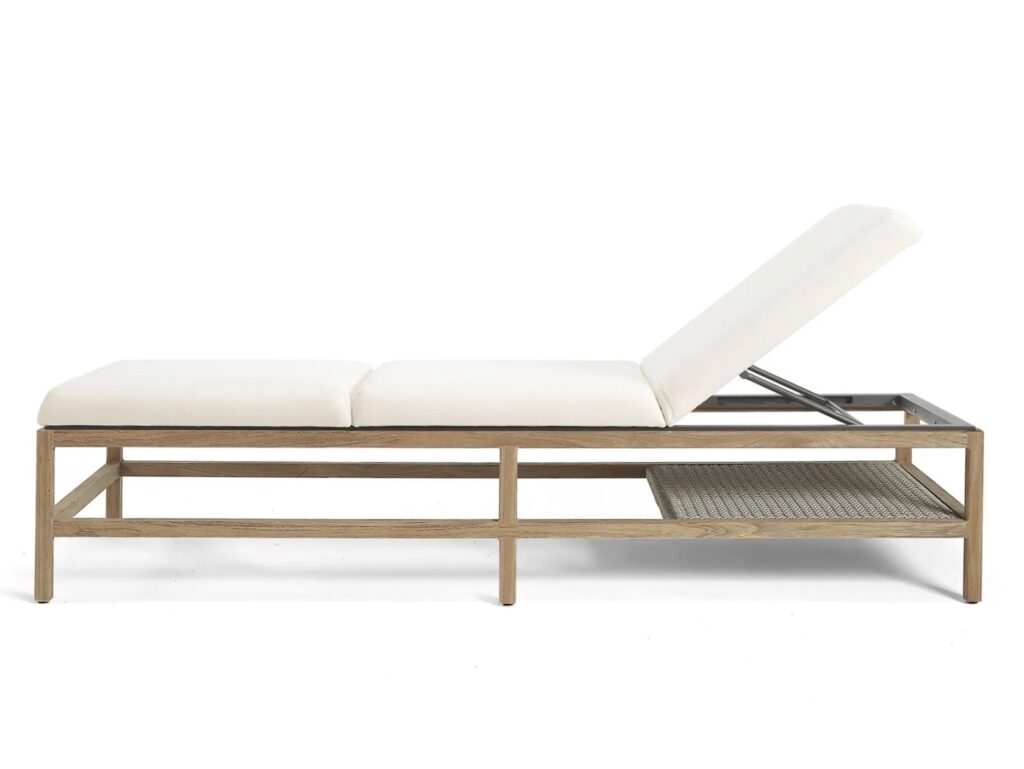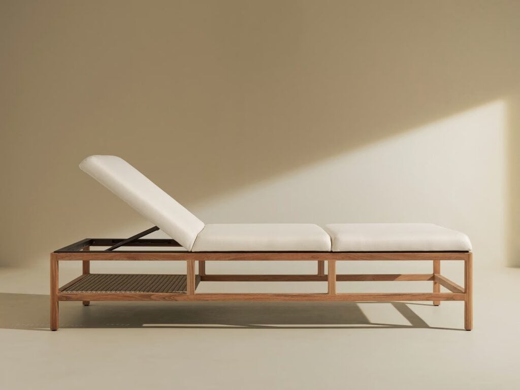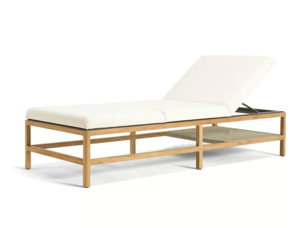 Massgeschneiderte Eleganz und grosszügige Abmessungen zeichnen auch die Sonnenliege GRAND LIFE aus, die durch grosse, weiche Kissen aussergewöhnlich bequem ist. Der Rahmen besteht aus Teakholz mit Metallkern, der für Robustheit und Solidität sorgt, während das charakteristische, elegante Geflecht aus Acrylkordel, das die Lehnen der Lounge-Möbel bildet, an der praktischen Ablage unten an der Liege aufgegriffen wird.