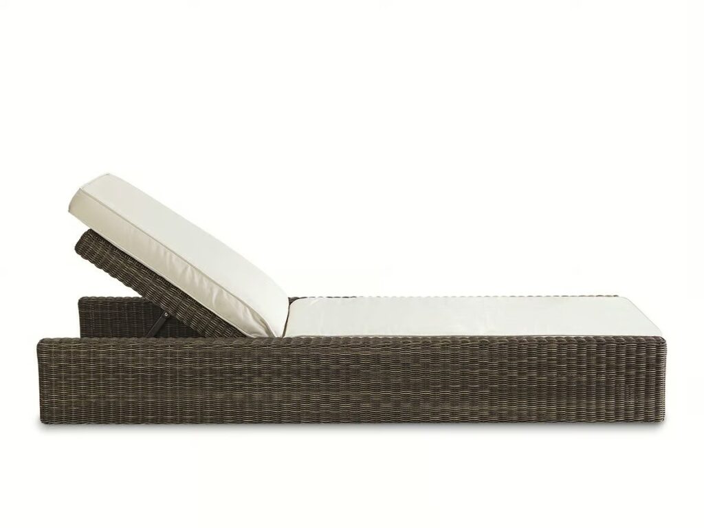 Cube ist eine Sonnenliege aus EtWick-Faser mit verstellbarer Rückenlehne, einschliesslich Matratze (in verschiedenen Stofffarben) und Rahmen in Rindenfarbe und Weiss.