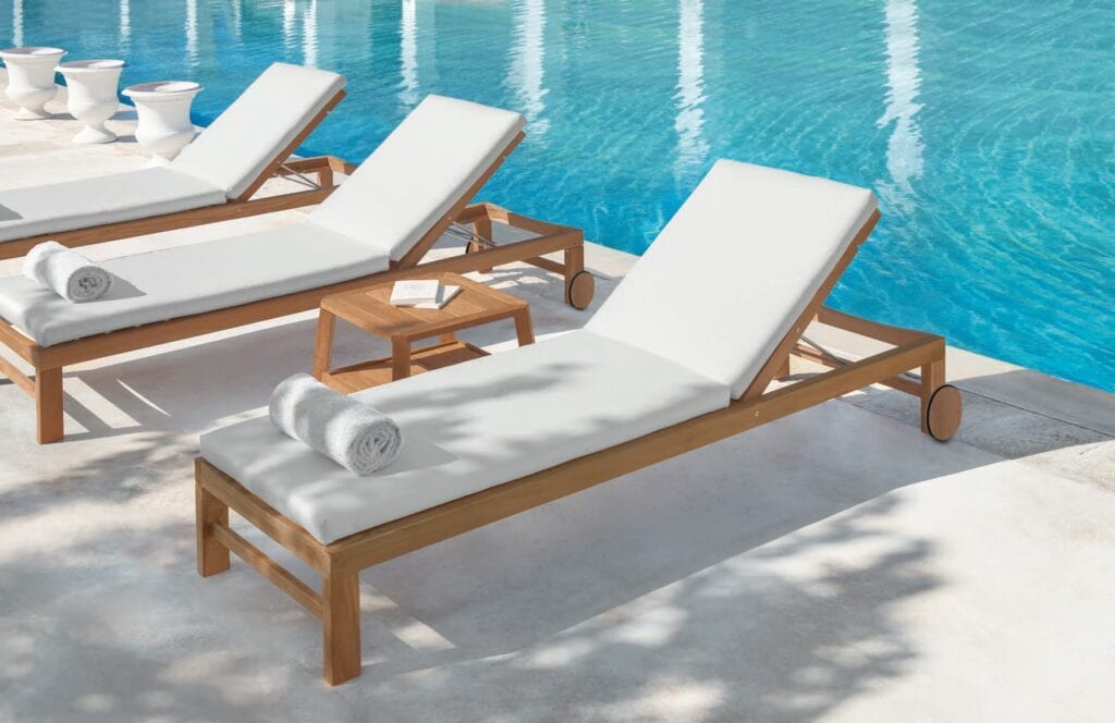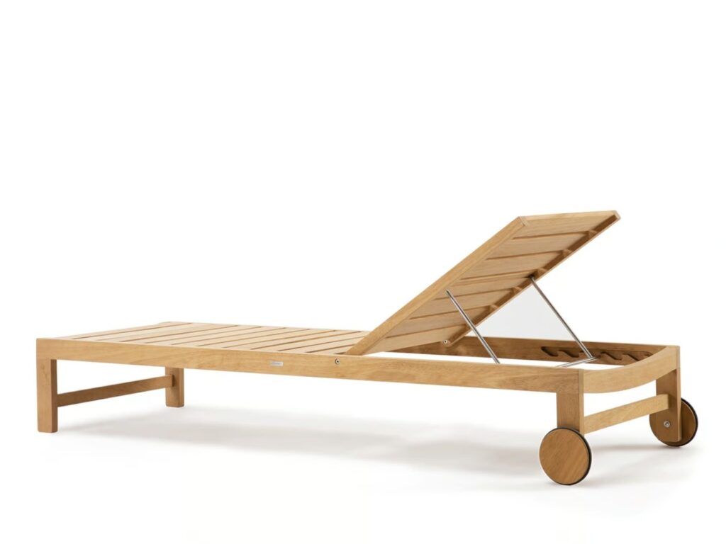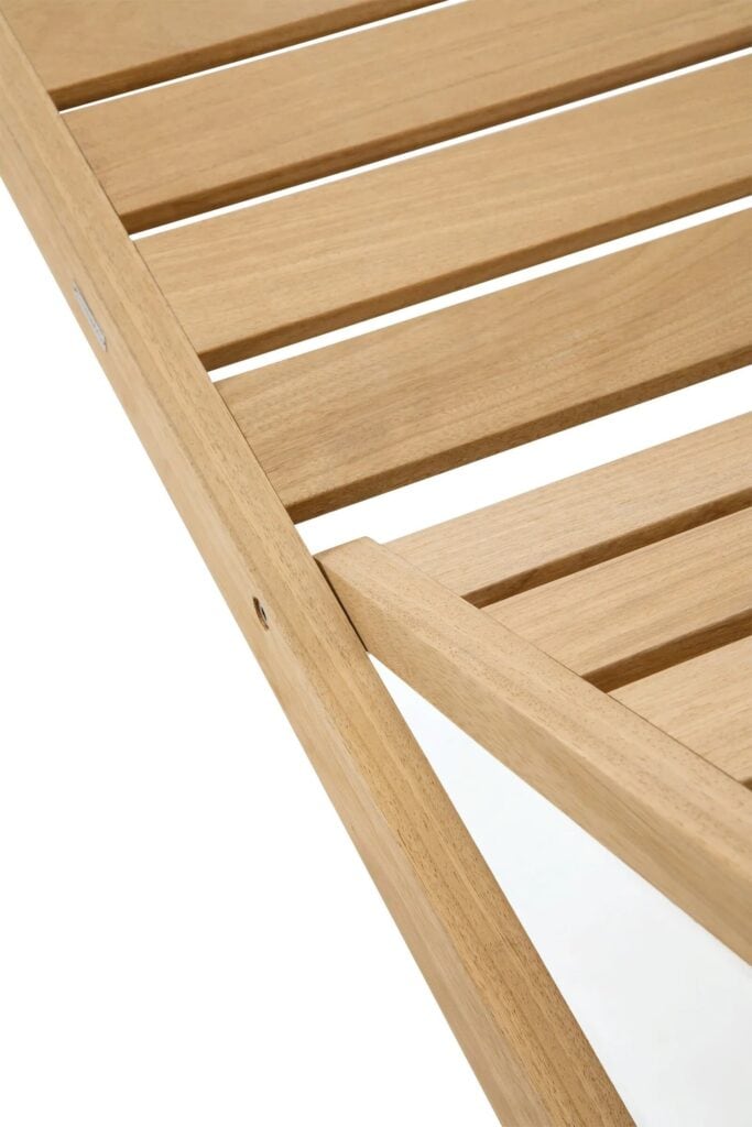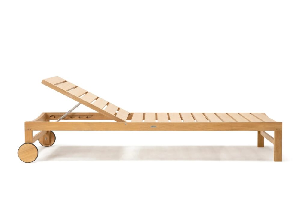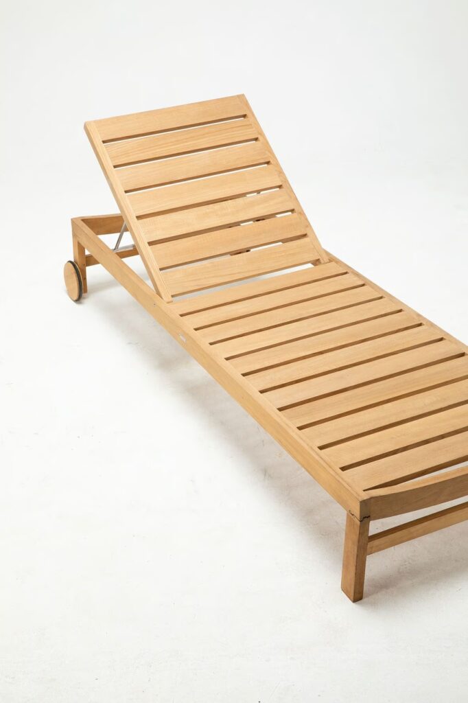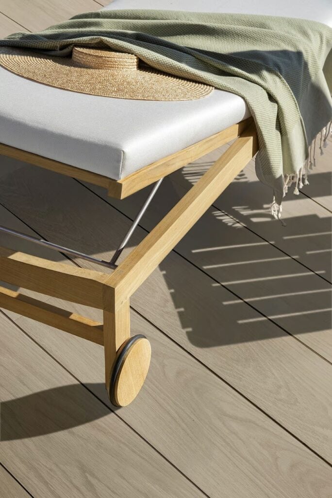 Der solide und rationelle Holzrahmen der Sonnenliege Sand mit verstellbarer Rückenlehne nimmt in der leichteren Lösung einen bequemen wasserdichten Stoff oder in der Version aus durchgehendem Teakholz eine weiche Matratze auf.