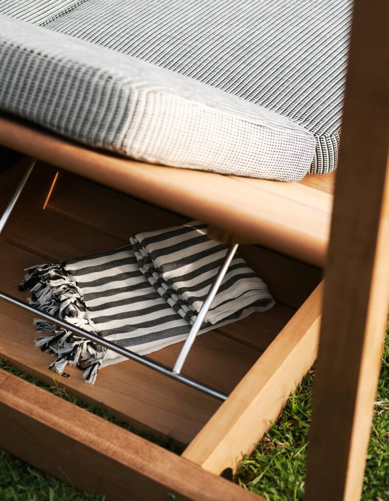 Wie eine Inselgruppe aus Elementen, die um eine große Iroko-Holzlatte herum entworfen und angeordnet sind. Ein besonderes Element ist die Kombinierbarkeit zwischen seinen Komponenten: Sonnenliegen, Tische, Pavillons, die Sie am Pool, auf einem Boot oder am Meer genießen können. In diesen Komfortinseln wird die Wahl der Farbe – zwischen Holz und Bezügen – zu einer weiteren Variablen: Das Holz ist naturbelassen oder in drei entsättigten Variationen lackiert, mit sichtbarer Maserung; Bei den Stoffen für die Kissen gibt es eine große Auswahl an Farben, die zusätzlich zur dickeren Armlehne in zwei Größen erhältlich sind.